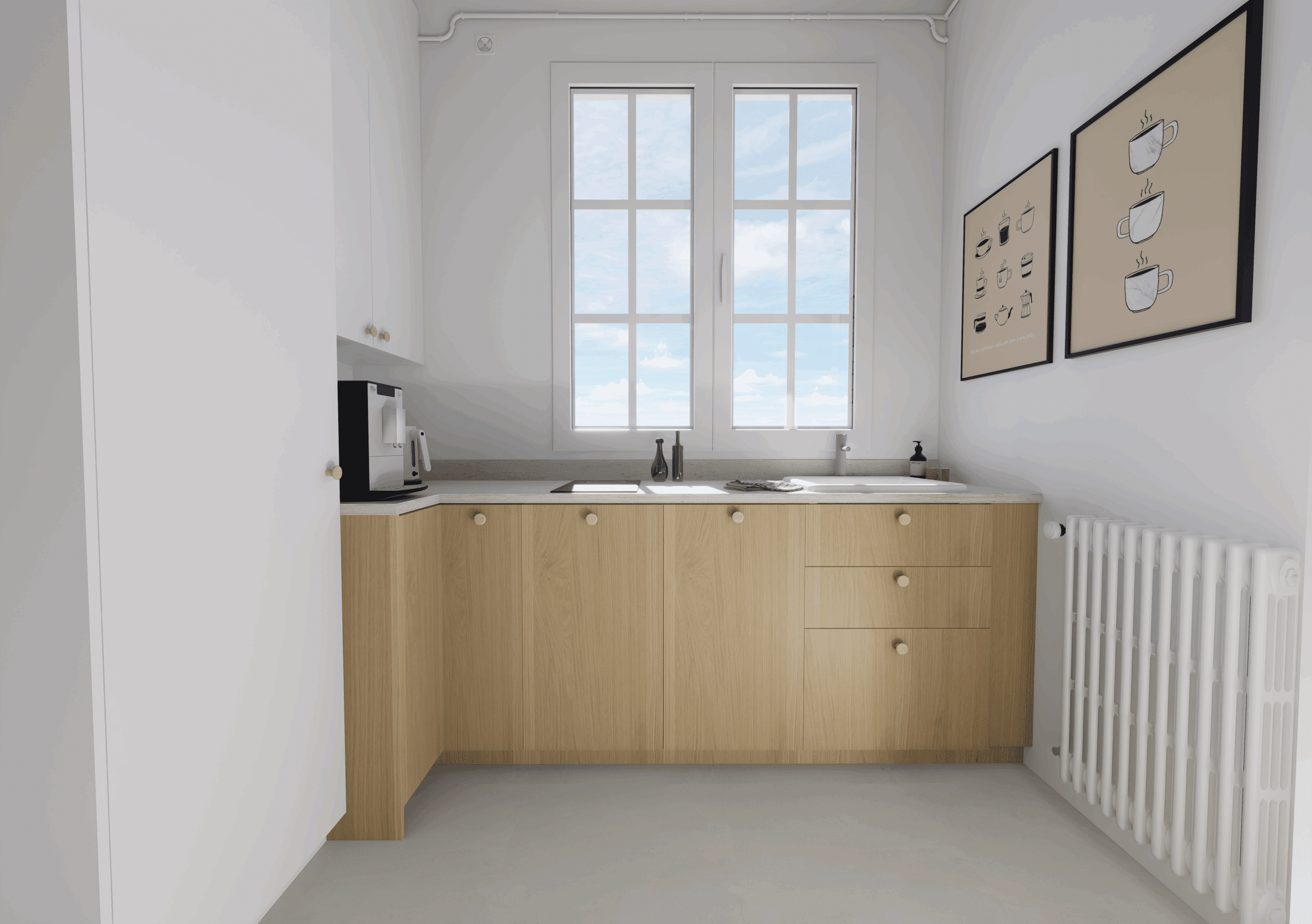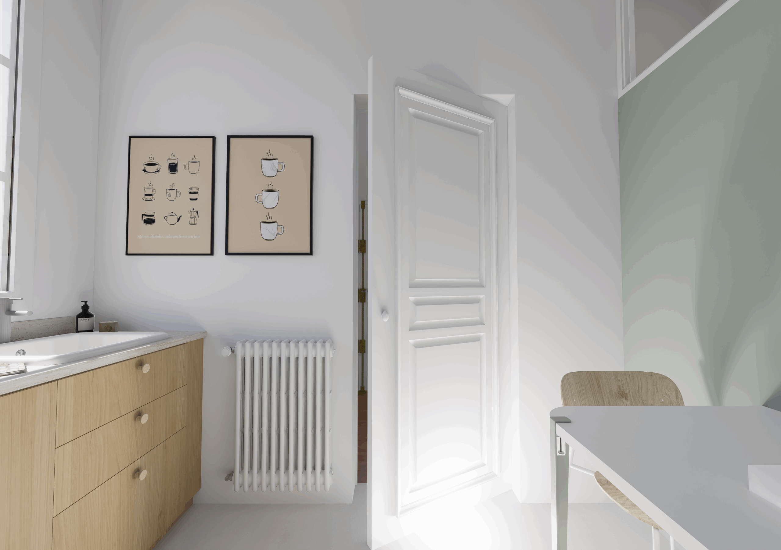 Ce projet concerne la rénovation complète d’une petite cuisine de 8 m² dans un appartement à Saint-Germain-en-Laye. L’espace, restreint mais naturellement lumineux, devait être totalement repensé pour devenir plus fonctionnel et accueillant. Les propriétaires souhaitaient intégrer une zone repas permettant d’accueillir jusqu’à quatre personnes, tout en conservant suffisamment de rangement et en intégrant l’ensemble des équipements nécessaires au quotidien. L’intervention a donc porté sur une optimisation millimétrée des volumes, avec une attention particulière à la fluidité des déplacements, à la luminosité et à l’ergonomie générale.