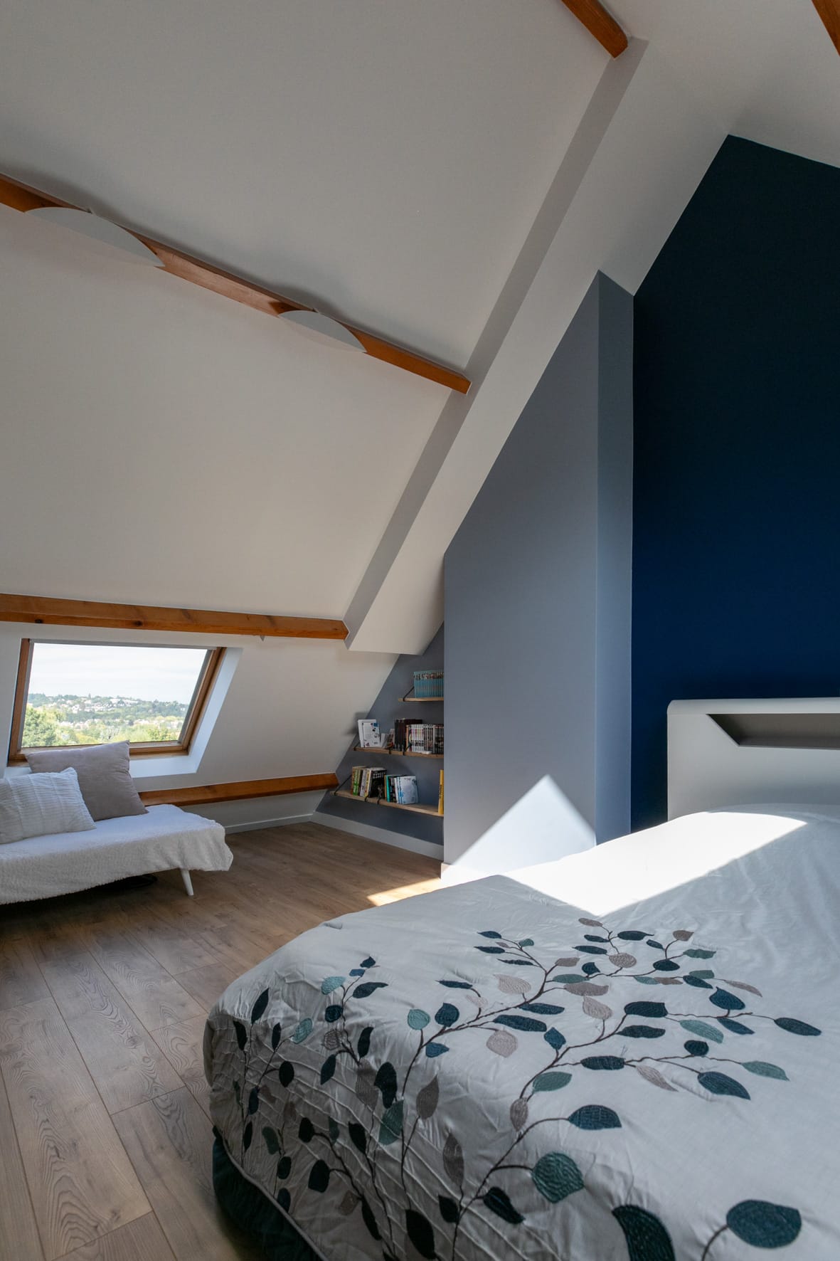 Une vaste pièce sous combles a été créée pour optimiser les volumes. Cet espace supplémentaire est devenu une véritable pièce de vie, fonctionnelle et chaleureuse.